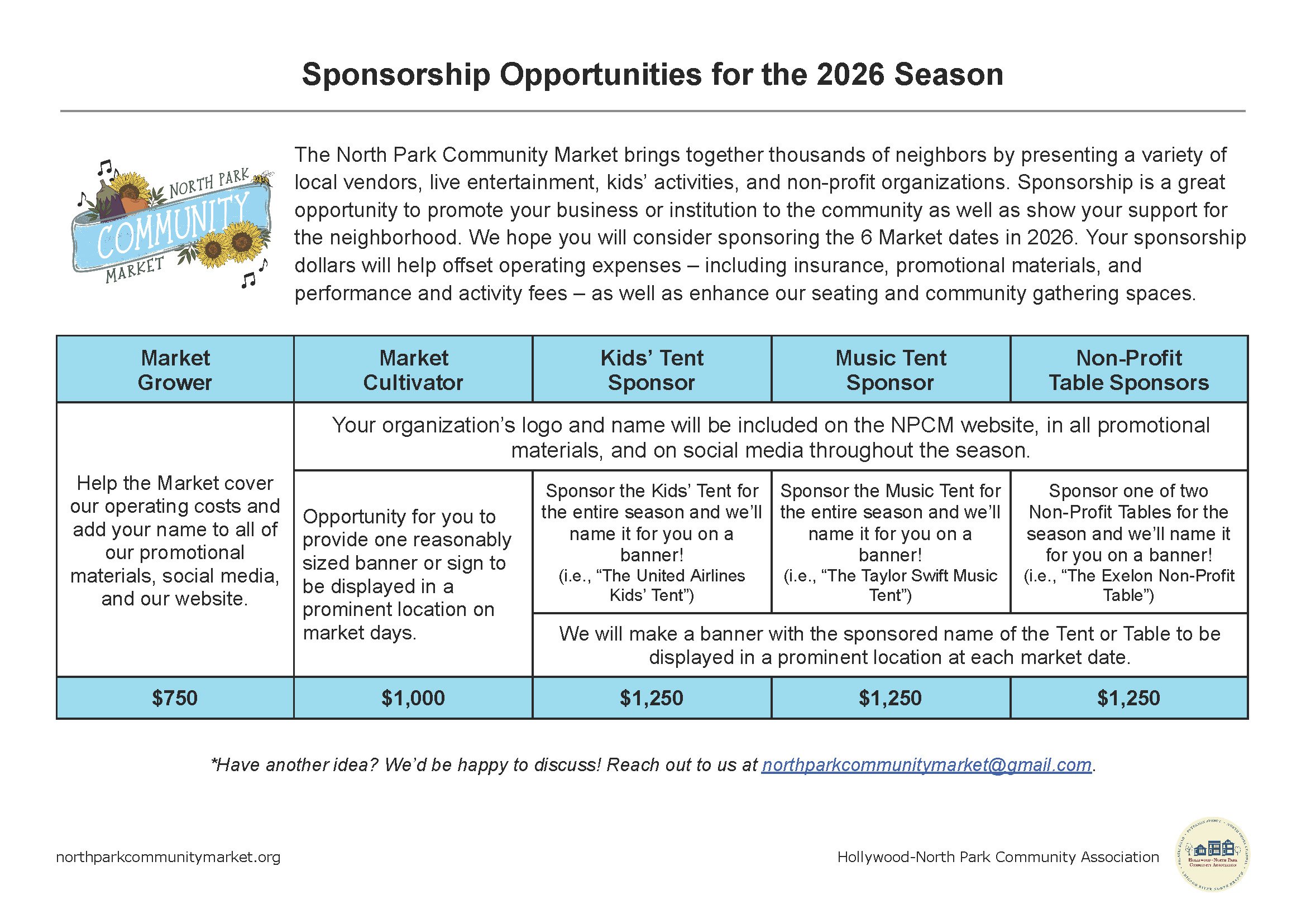 The North Park Community Market brings together thousands of neighbors by presenting a variety of local vendors, live entertainment, kids’ activities, and non-profit organizations. Sponsorship is a great opportunity to promote your business or institution to the community as well as show your support for the neighborhood. We hope you will consider sponsoring the 6 Market dates in 2025. Your sponsorship dollars will help offset operating expenses – including insurance, promotional materials, and performance and activity fees – as well as enhance our seating and community gathering spaces.